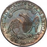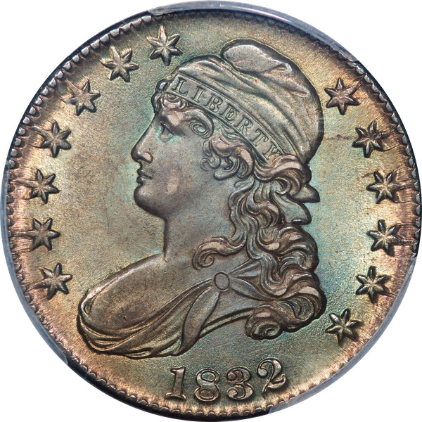 Startling, iridescent hues of aqua and gold blaze with vibrant luster. The devices are intricately detailed. The reverse die break, hallmark of the Large Letters variety, is in full flower. A truly captivating coin. Estimate: $2,500 to $3,000