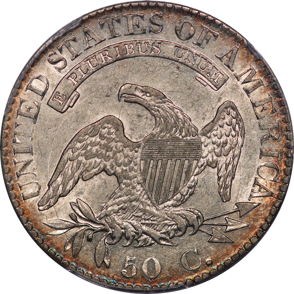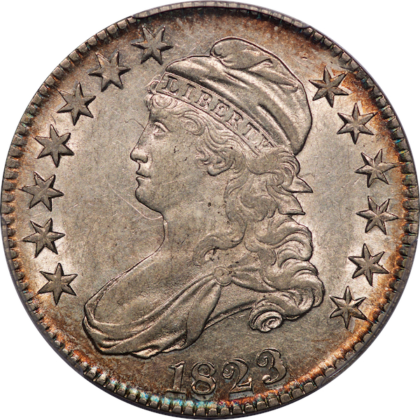 Broken, patched and ugly – three Red Book varieties of 1823. The first and last are especially difficult to find in high grade. Check your AMBPR for confirmation. (Email me if yours is out of date.) Here is an untoned, lustrous and flashy example of the Ugly 3. A thin band of gold runs through the dentils, nicely framing the brilliant centers. The Link provenance is noted on the PCGS label. From MB 43, lot 38, Aug. 2016 at $3,740. Estimate: $3,000 to $3,500