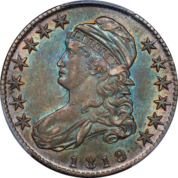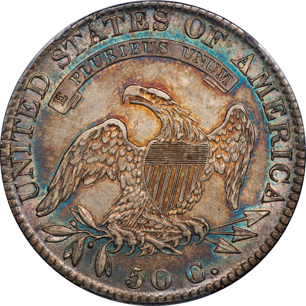 Blue-green toning dominates the obverse; grey and russet encompass the eagle. Both sides feature colorful iridescence at the peripheries. Minor luster breaks in the fields account for the XF designation. The coin would doubtless fit an AU date or Red Book set. Another coin with exceptional eye-appeal, as expected from coins bearing the Kings Parkprovenance.